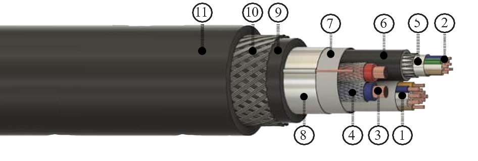 1. Токопроводящие жилы телекоммуникационных пар – медные однопроволочные, 1 класс по ГОСТ 22483- 2021 с изоляцией из сплошного полиэтилена. 2. Токопроводящие жилы LAN-сердечника – медные однопроволочные с изоляцией из сплошного полиэтилена. 3. Токопроводящие жилы жил управления / питания / жила заземления –медные многопроволочные, 5 класс по ГОСТ 22483-2021 с изоляцией из поливинилхлоридного пластиката или полимерной композиции, не содержащей галогенов. 4. Индивидуальный экран телекоммуникационных пар, жил управления / питания – оплетка из медных луженых проволок (э) или алюмополимерная лентас контатным проводником из медной луженой проволоки (эф). 5. Общий экран LAN-сердечника – алюмополимерная лента и оплетка из медных луженых проволок (SF). 6. Индивидуальная оболочка LAN-сердечника – поли- мерный материал совместимый с материалом наружной оболочки. 7. Поясная изоляция – водоблокирующая лента (для кабелей нг(А)-HF) и полиэтилентерефталатная пленка. 8. Общий экран – алюмополимерная лента с контактным проводником из медной луженой проволоки (Э). 9. Внутренняя оболочка – материал, совместимый с материалом наружной оболочки. 10. Броня – стальные оцинкованные проволоки в виде оплетки (Ко). 11. Наружная оболочка – поливинилхлоридный пластикат (В), поливинилхлоридный пластикат пониженной горючести (Внг(А)), поливинилхлоридный пластикат пониженной пожароопасности с низким дымо- и газо- выделением (Внг(А)-LS), полимерная композиция, не содержащая галогенов (Пнг(А)-HF).