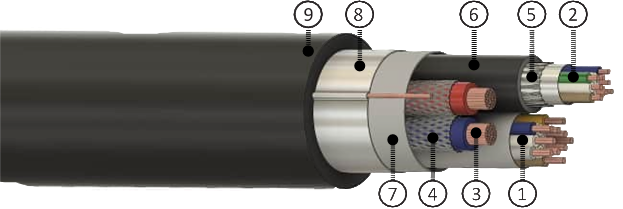 1. Токопроводящие жилы телекоммуникационных пар – медные однопроволочные, 1 класс по ГОСТ 22483- 2021 с изоляцией из сплошного полиэтилена. 2. Токопроводящие жилы LAN-сердечника – медные однопроволочные с изоляцией из сплошного полиэтилена. 3. Токопроводящие жилы жил управления / питания / жила заземления – медные многопроволочные, 5 класс по ГОСТ 22483-2021 с изоляцией из поливинилхлоридного пластиката или полимерной композиции, не содержащей галогенов. 4. Индивидуальный экран телекоммуникационных пар, жил управления / питания – оплетка из медных луженых проволок (э) или алюмополимерная лента с контатным проводником из медной луженой проволоки (эф). 5. Общий экран LAN-сердечника – алюмополимерная лента и оплетка из медных луженых проволок (SF). 6. Индивидуальная оболочка LAN-сердечника – полимерный материал совместимый с материалом наружной оболочки. 7. Поясная изоляция – водоблокирующая лента (для кабелей нг(А)-HF) и полиэтилентерефталатная пленка. 8. Общий экран – алюмополимерная лента с контактным проводником из медной луженой проволоки (Э). 9. Наружная оболочка – поливинилхлоридный пластикат (В), поливинилхлоридный пластикат пониженной горючести (Внг(А)), поливинилхлоридный пластикат пониженной пожароопасности с низким дымо- и газо- выделением (Внг(А)-LS), полимерная композиция, не содержащая галогенов (Пнг(А)-HF).