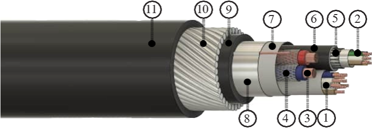 1. Токопроводящие жилы телекоммуникационных пар – медные однопроволочные, 1 класс по ГОСТ 22483- 2021 с изоляцией из сплошного полиэтилена. 2. Токопроводящие жилы LAN-сердечника – медные однопроволочные с изоляцией из сплошного полиэтилена. 3. Токопроводящие жилы жил управления / питания / жила заземления –медные многопроволочные, 5 класс по ГОСТ 22483-2021 с изоляцией из поливинилхлоридного пластиката или полимерной композиции, не содержащей галогенов. 4. Индивидуальный экран телекоммуникационных пар, жил управления / питания – оплетка из медных луженых проволок (э) или алюмополимерная лента с контатным проводником из медной луженой проволоки (эф). 5. Общий экран LAN-сердечника – алюмополимерная лента и оплетка из медных луженых проволок (SF). 6. Индивидуальная оболочка LAN-сердечника – поли- мерный материал совместимый с материалом наружной оболочки. 7. Поясная изоляция – водоблокирующая лента (для кабелей нг(А)-HF) и полиэтилентерефталатная пленка. 8. Общий экран – алюмополимерная лента с контактным проводником из медной луженой проволоки (Э). 9. Внутренняя оболочка – материал, совместимый с материалом наружной оболочки. 10. Броня – стальные оцинкованные проволоки в виде сплошного концентрического повива (К). 11. Наружная оболочка – поливинилхлоридный пластикат (В), поливинилхлоридный пластикат пониженной горючести (Внг(А)), поливинилхлоридный пластикат пониженной пожароопасности с низким дымо- и газо- выделением (Внг(А)-LS), полимерная композиция, не содержащая галогенов (Пнг(А)-HF).